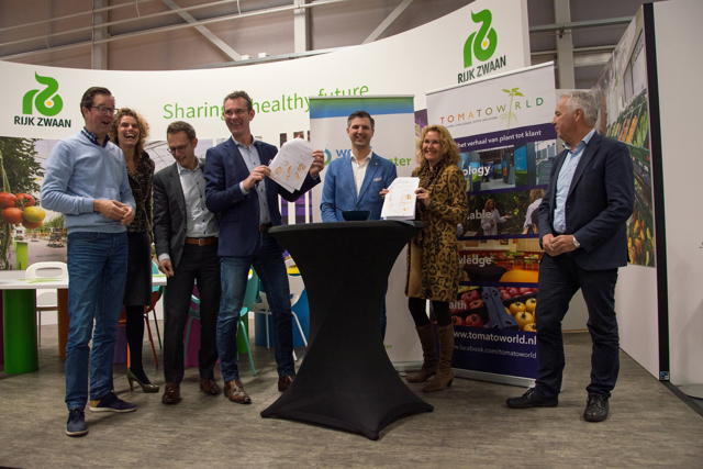- Photo caption: Mark Zwinkels, Erwin Cardol of World Horti Center and Miranda van den Ende of Tomatoworld sign the agreement of intent with brother blood (tomato soup).